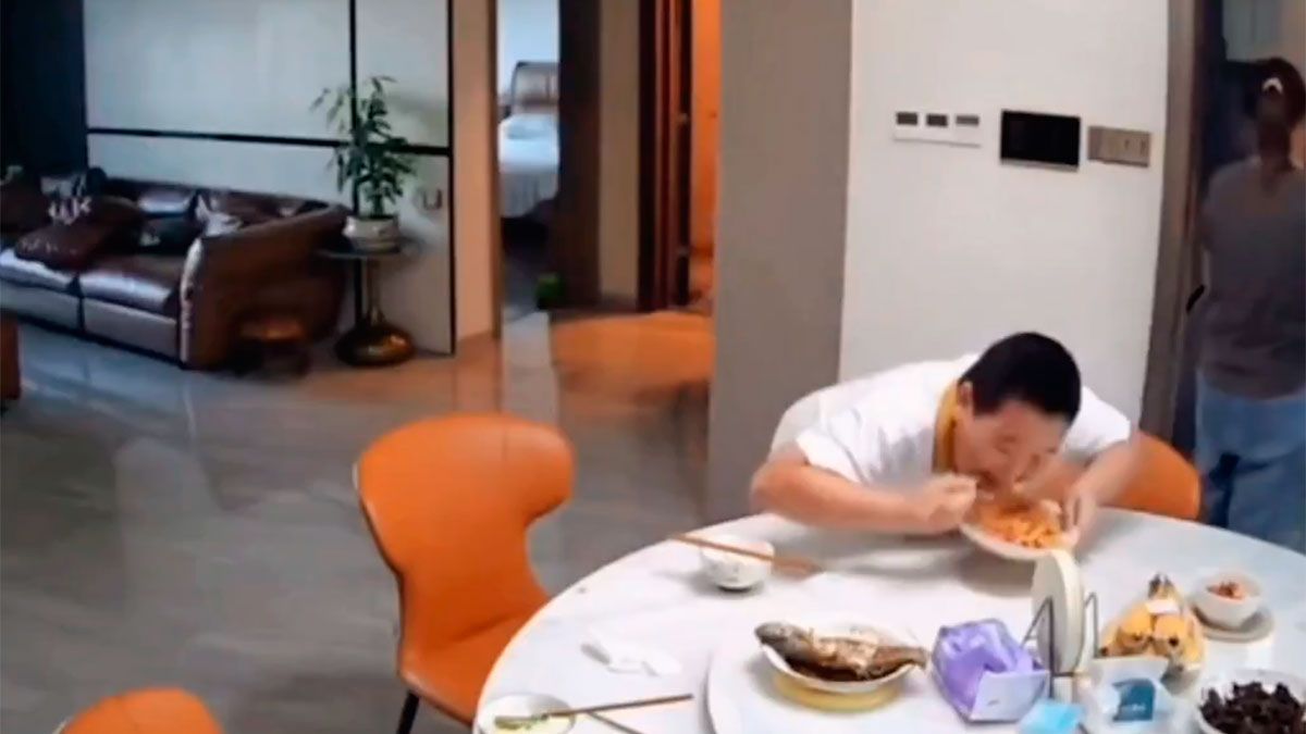 Su padre enfurecido lo obligó a devolver todo a la mesa. El pequeño glotón lo hizo, no sin antes comer un poco más.