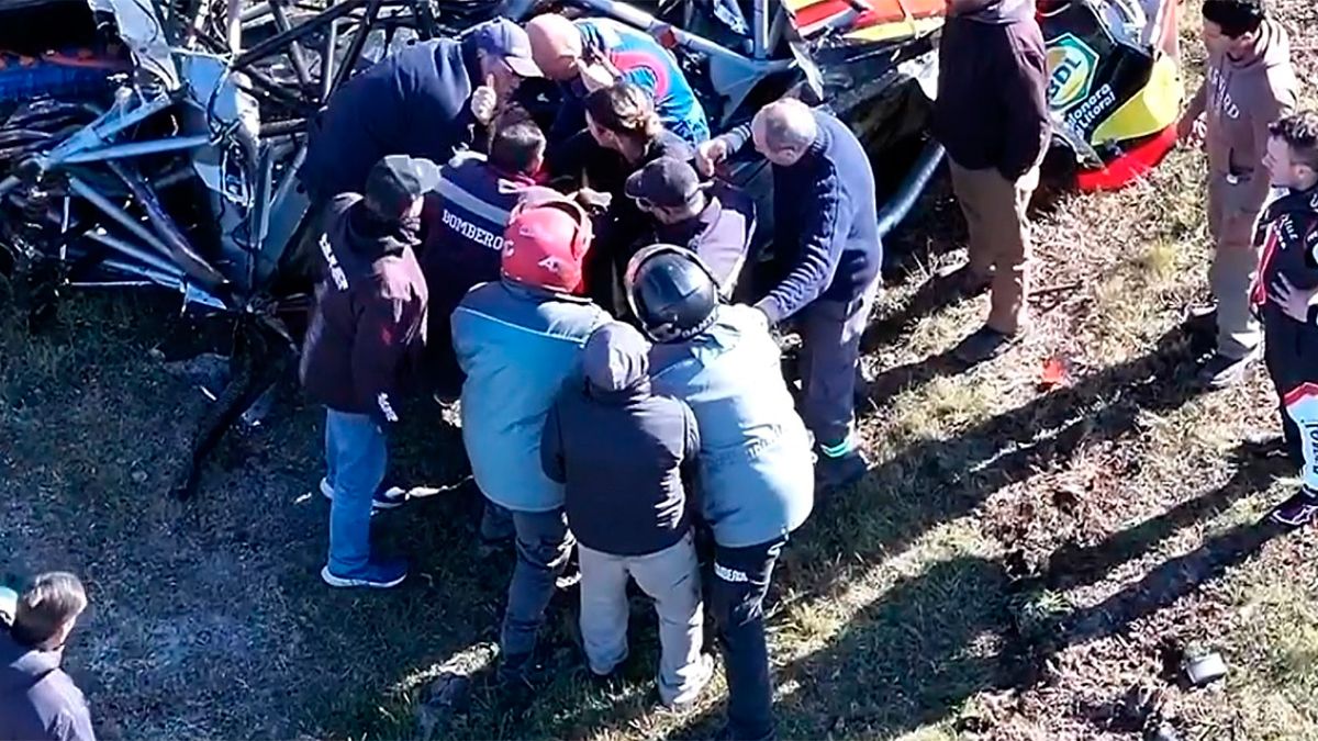 El siniestro ocurrió a dos vueltas del final, cuando Nicolás Impiombato lo tocó desde atrás en plena recta. Ese leve contacto desvió la trayectoria de Martínez, cuyo auto terminó despedido hacia el césped y comenzó a dar 12 vueltas campana a gran velocidad, perdiendo piezas en el trayecto.