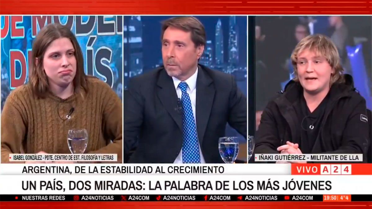 El segmento, presentado como "la palabra de los más jóvenes", tenía como invitados a Iñaki Gutiérrez, militante libertario y community manager del Presidente, y a Isabel González, presidenta del Centro de Estudiantes de la Facultad de Filosofía y Letras de la Universidad de Buenos Aires.