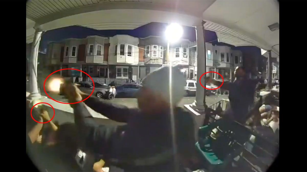 Se puede ver a un hombre junto a la cámara del timbre Ring disparando su pistola semiautomática sin control sobre el grupo de personas directamente a sus pies.