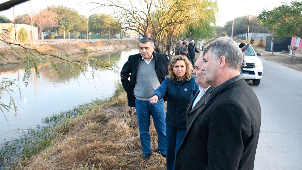 La intendente de la Capital, Ing. Norma Fuentes y el ministro de Obras, Servicios Públicos y Agua de la Provincia, Aldo Hid; acompañados por el secretario de Obras Públicas, Jorge Zuaín y el subsecretario del Agua, Sergio Saltz; supervisaron los trabajos de limpieza y desmalezamiento de los bordes del canal San Martín.