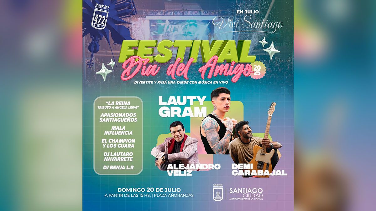 Será a partir de las 15 horas con una grilla conformada por Lauty Gram, Alejandro Veliz, Demi Carabajal, junto a bandas y artistas locales como La Reina (con el tributo a Ángela Leiva), Apasionados Santiagueños, Mala Influencia, El Champion y los Guara, DJ Lautaro Navarrete y DJ Benja L.R..