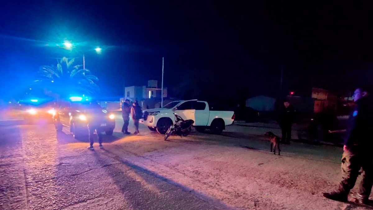 Antes de las 21 horas de este martes se produjo un accidente de tránsito en la intersección de Av. Dunas y calle Alberdi, del barrio Rivadavia, done na camioneta Toyota Hilux blanca conducida por un hombre de apellido Palavecino, fue impactada por un motovehículo Zanella ZB sin luces, ni patente, conducido por un joven identificado como de apellido Pogonza, de 22 años de edad.