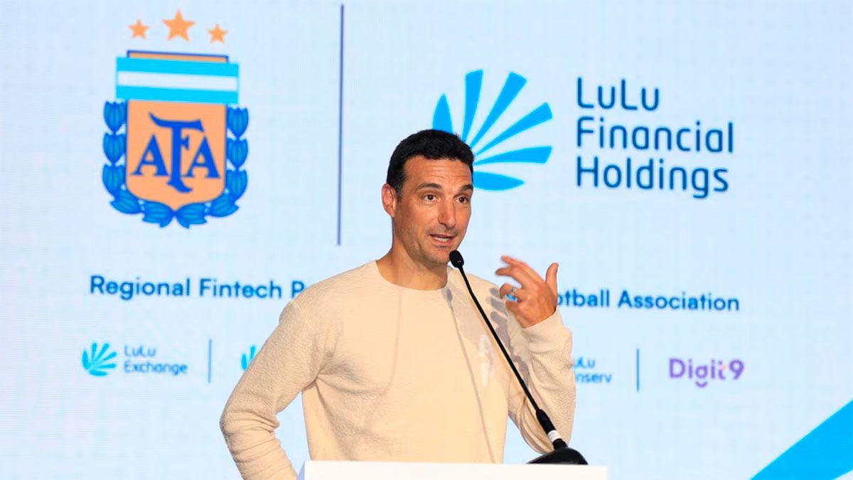 Lionel Scaloni, entrenador de la Selección Argentina, participó de un acto en Emiratos Árabes Unidos junto a dirigentes de la Asociación del Fútbol Argentino (AFA), en el marco del anuncio de un acuerdo estratégico con LuLu Financial Holdings, grupo que patrocinará a la AFA a través de sus marcas LuLu Exchange y LuLu Money.