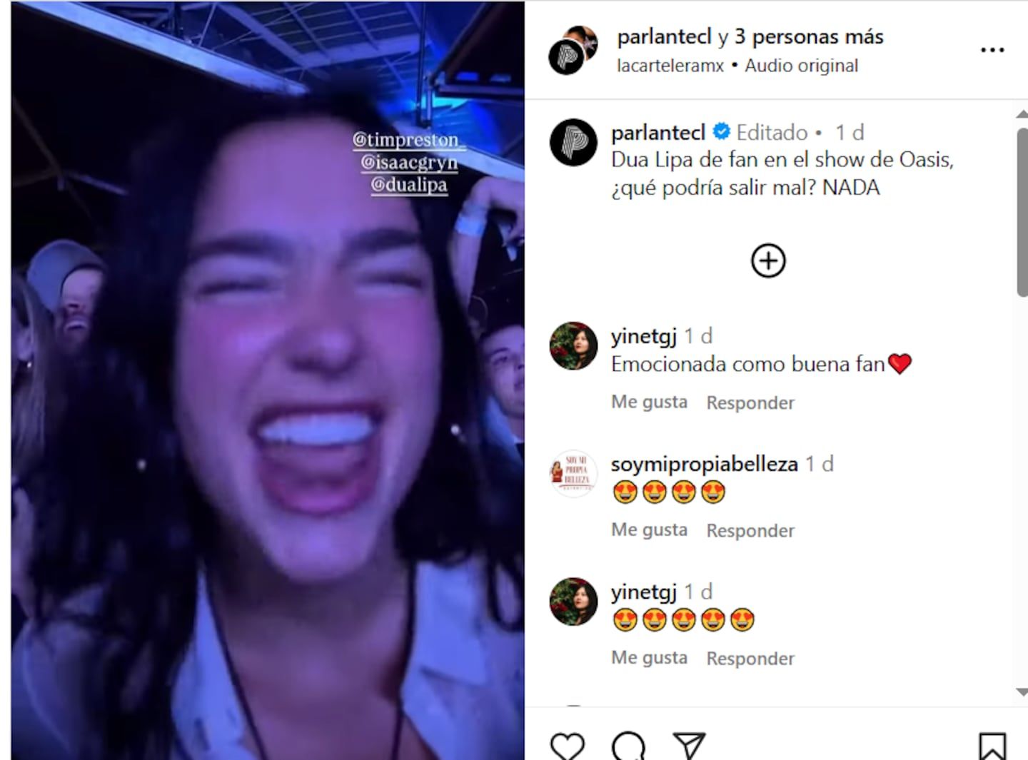 Varias figuras estuvieron en las anteriores actuaciones, como Josep Guardiola, quien disfrutó de una noche histórica en Manchester. En las redes sociales, aparecieron algunos videos con la presencia de Dua Lipa en Wembley, como una fanática más. Un usuario compartió el momento donde se la ve a la estrella cantando uno de los clásicos del grupo.