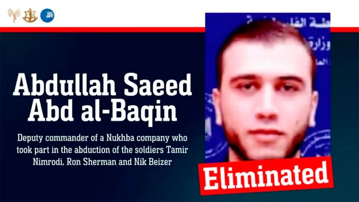 Las Fuerzas de Defensa de Israel (FDI) y el Shin Bet (la agencia de seguridad interior israelí) anunciaron este miércoles la eliminación de Abdullah Saeed Abdel Baqin, quien ejercía como subcomandante de la compañía Nukhba en el Batallón Central de Jabalia del grupo terrorista Hamas, según un comunicado conjunto.