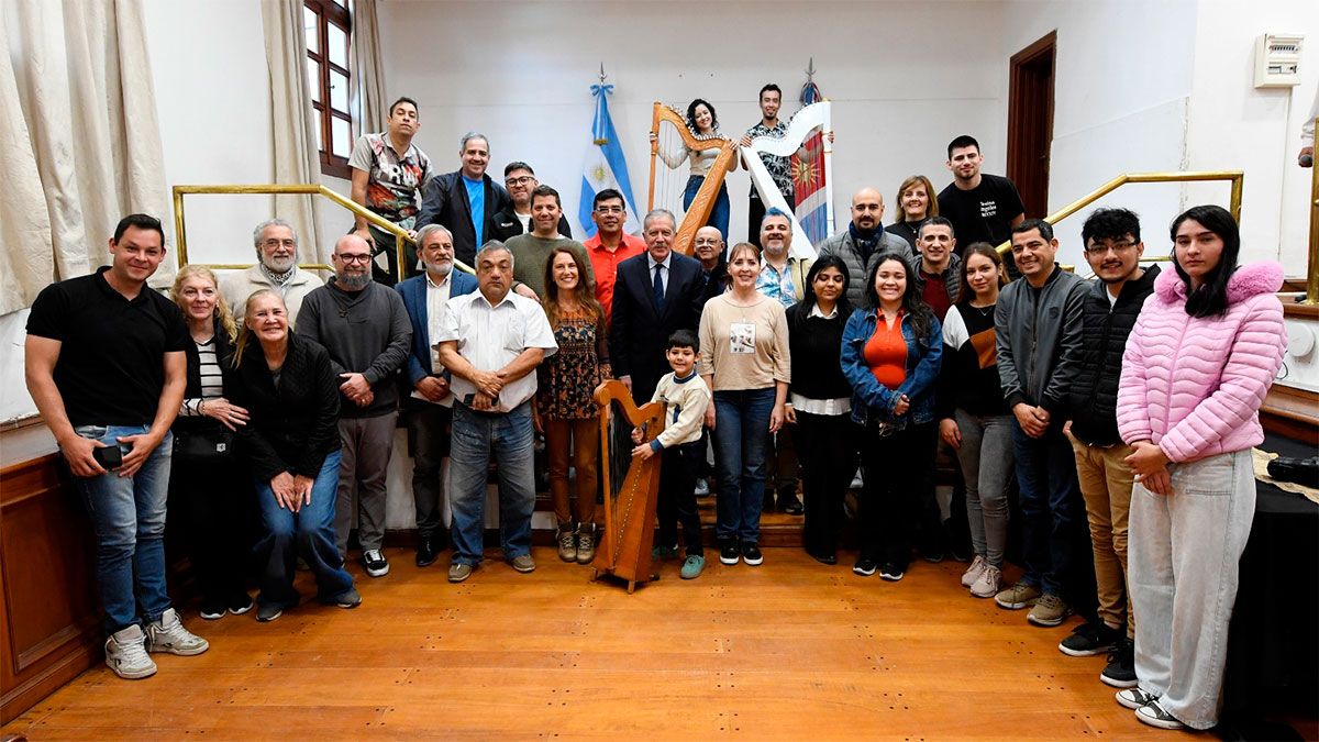 El jefe de Gabinete, Elías Suárez, recibió este jueves por la mañana en Casa de Gobierno a artistas que participarán del 21° Encuentro Latinoamericano Mishquila de Arpas, que se realizará del 20 al 23 de agosto con conciertos en el Centro de Convenciones Fórum y en el Teatro 25 de Mayo.