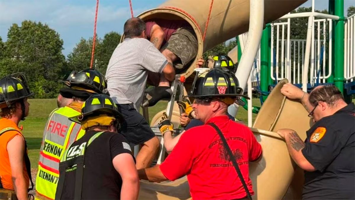 Un hombre de 40 años experimentó momentos de angustia el pasado sábado 16 de agosto por la tarde después de quedar atrapado dentro de un tobogán tubular en el parque infantil de la Northeast Elementary School en Vernon, Connecticut. La emergencia movilizó a los cuerpos de rescate locales, quienes cortaron parte de la estructura para liberar al individuo, según comunicó el Vernon Fire Department y reportó NBC News.