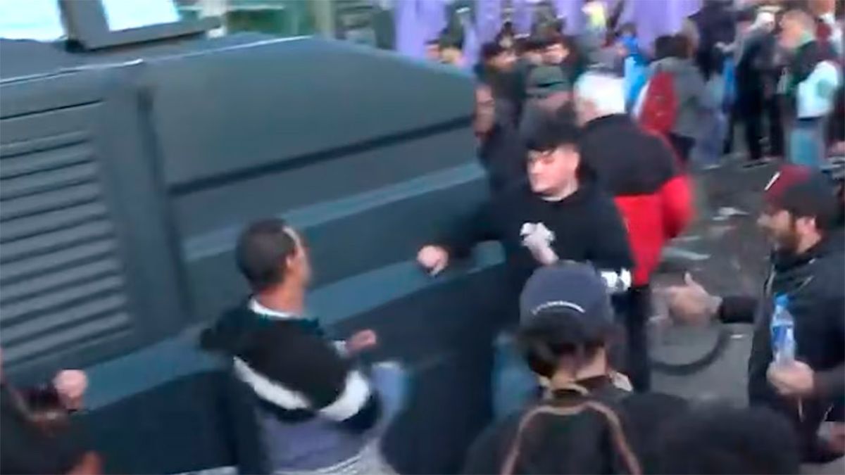 Las imágenes muestran a un joven que, a juzgar por las voces y el contexto, parece ser un militante libertario que es abordado con gritos y agresiones verbales por otras personas. El joven no reacciona, aunque permanece parado con mirada desafiante frente a quienes los increpan.