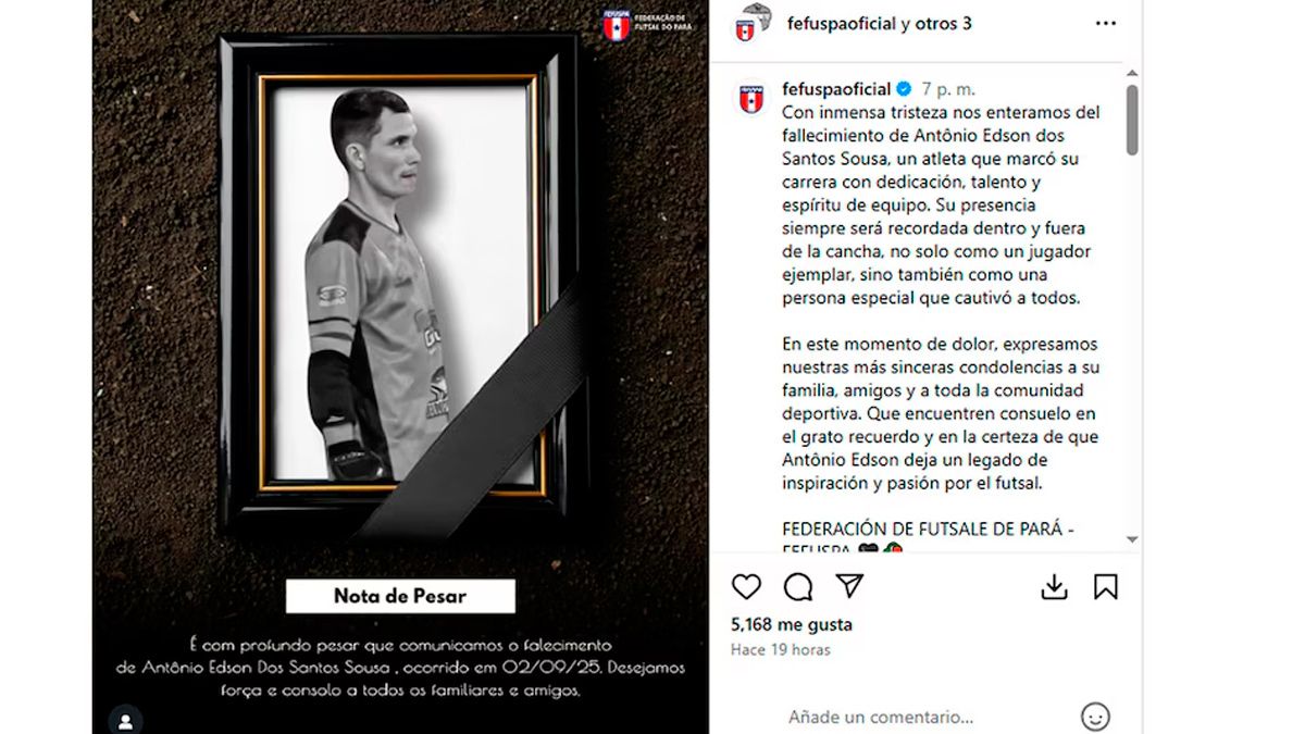 Además de la reacción de la comunidad local, la Federación Paraense de Fútbol Sala (FEFUSPA) utilizó su cuenta oficial de Instagram para publicar un comunicado oficial en el que lamenta la pérdida e invita a honrar la memoria del deportista. El mensaje subrayó: “Con inmensa tristeza nos enteramos del fallecimiento de Antonio Edson dos Santos Sousa, un atleta que marcó su carrera con dedicación, talento y espíritu de equipo. Su presencia siempre será recordada dentro y fuera de la cancha, no solo como un jugador ejemplar, sino también como una persona especial que cautivó a todos”. En el mismo comunicado, la federación reafirma la huella que deja Pixé, destacando: “Que encuentren consuelo en el grato recuerdo y en la certeza de que Antonio Edson deja un legado de inspiración y pasión por el futsal”.