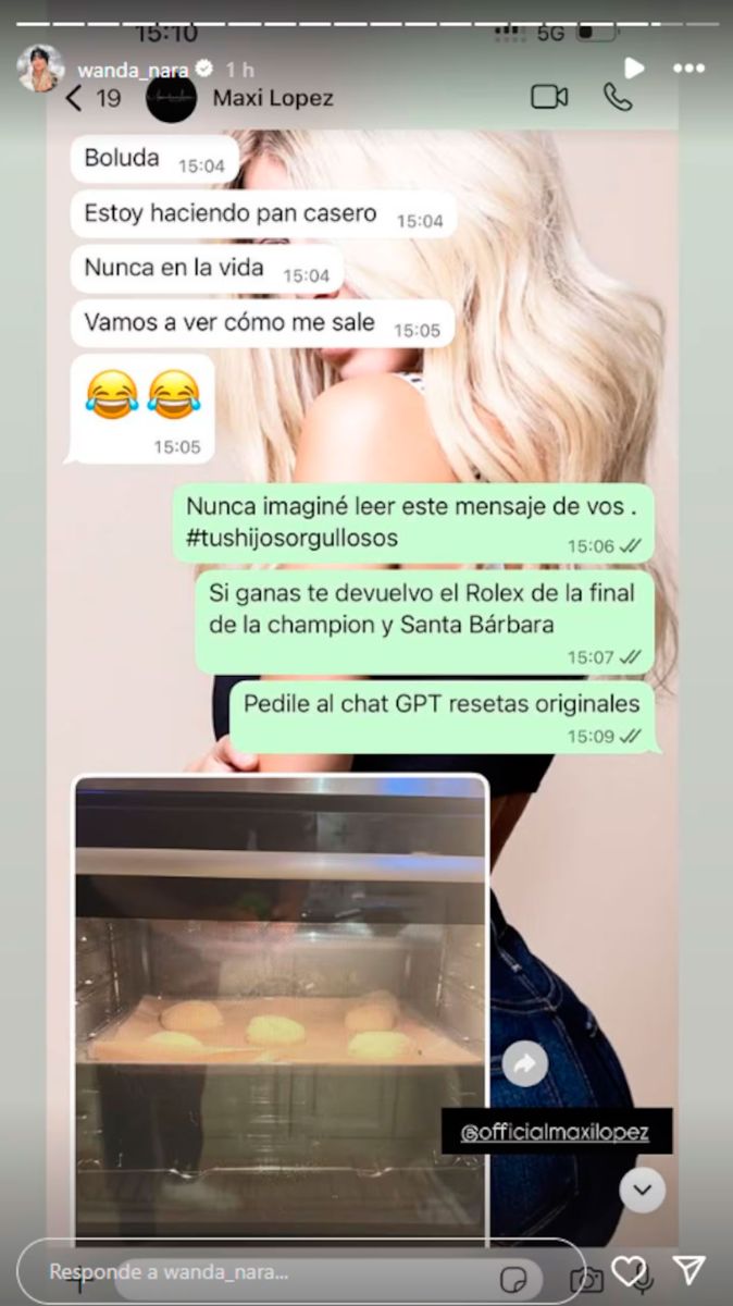 Acto seguido, el exdelantero del Barcelona le envió una foto de los panes horneándose, y un video de unos bifes cocinándose en una sartén. “Carne, lentejas y brócoli. Estoy a full, eh”, dijo Maxi. La respuesta de la hermana de Zaira fue tajante, pero cargada de humor: “La conductora no puede hablar mucho con los participantes. Seguí practicando, no busques acomodo. Te veo bien, sos competitivo”.