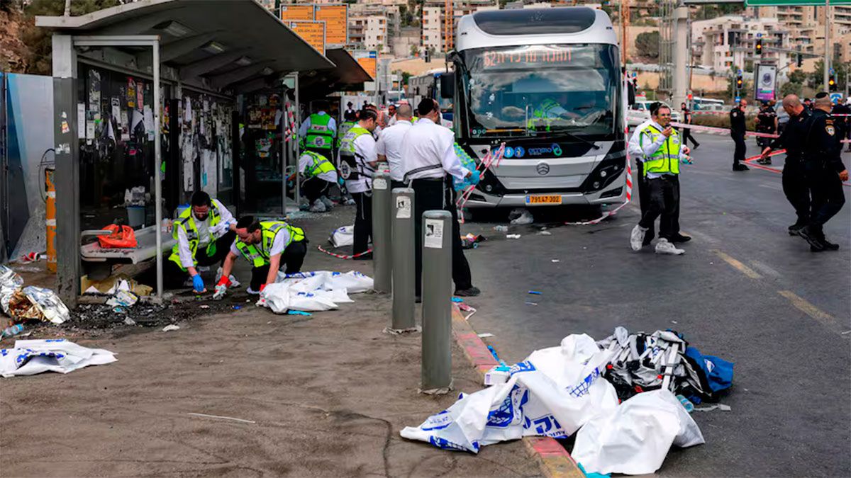 Imágenes del ataque mostraban a docenas de personas huyendo de una parada de colectivo en una concurrida intersección–en una ruta que conduce a asentamientos judíos ubicados en Jerusalén este- durante la hora pico de la mañana. Se veía también un colectivo con agujeros de balas en el parabrisas detenido en una parada, con pertenencias esparcidas por la calle.