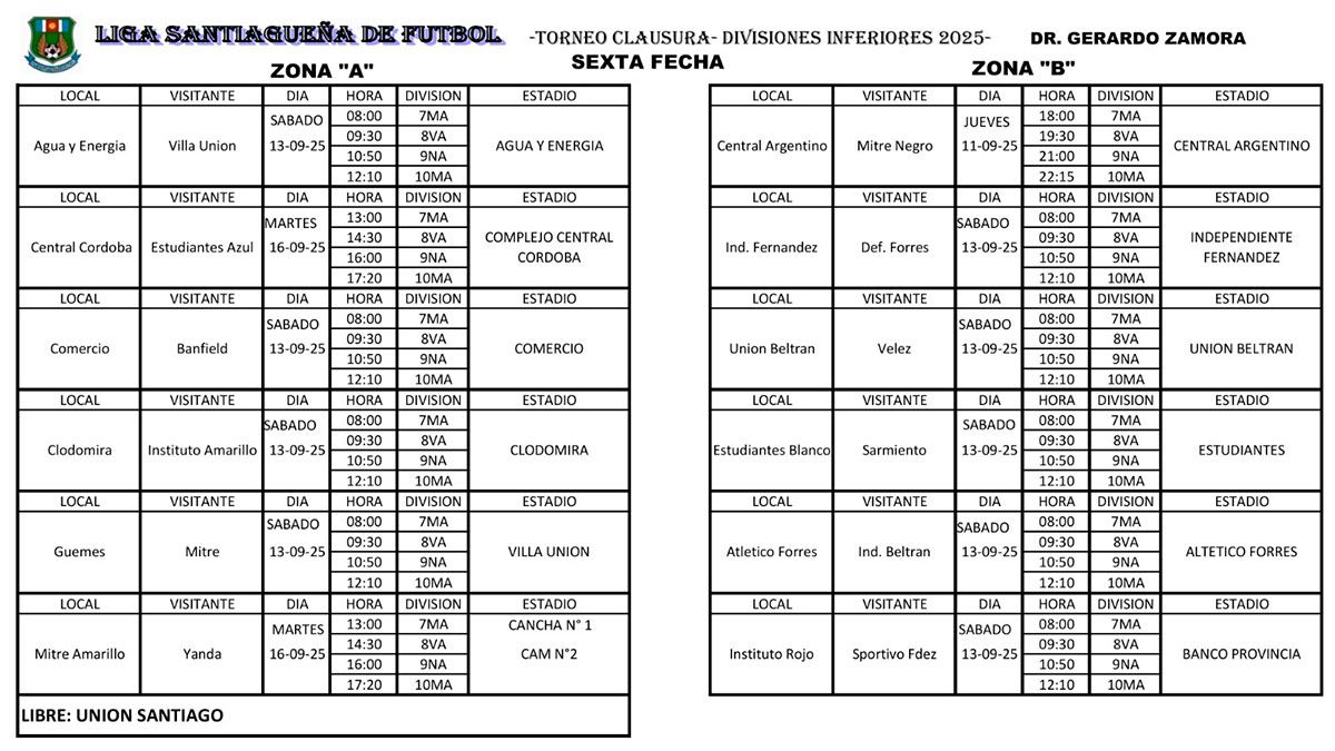 La Liga Santiagueña de Fútbol anunció oficialmente la programación de la sexta fecha del torneo de Divisiones Inferiores, edición Clausura 2025. La jornada comenzará el jueves 11 de septiembre y se extenderá hasta el martes 16 de septiembre, con encuentros en todas las categorías.