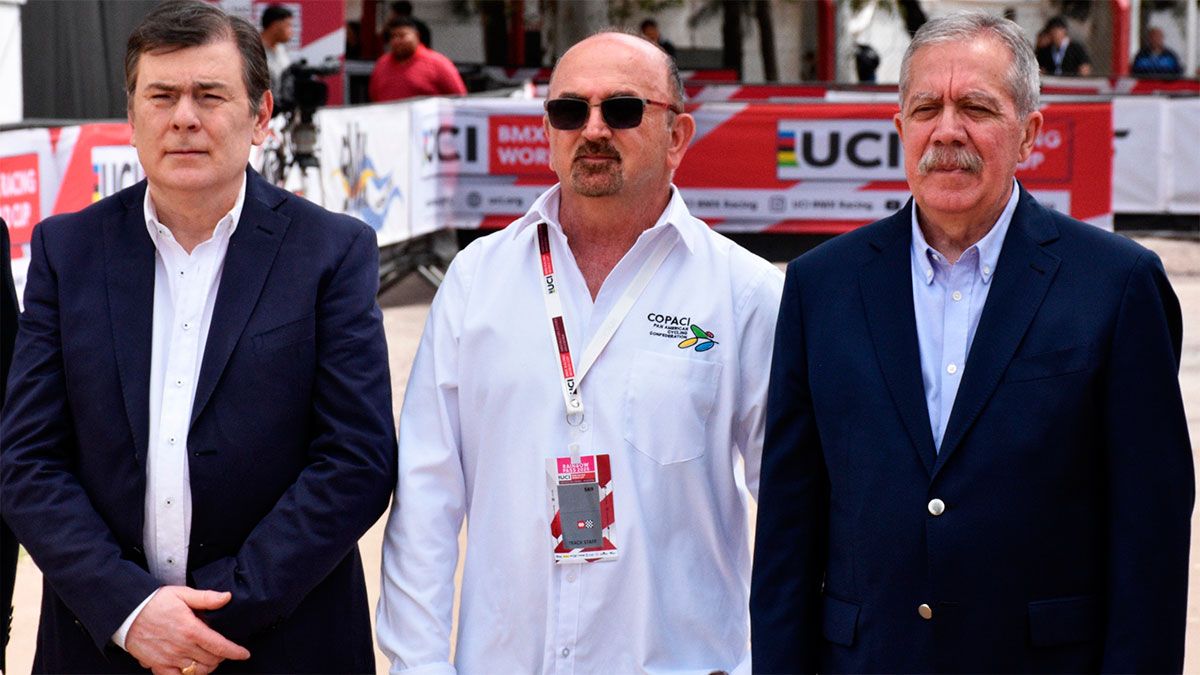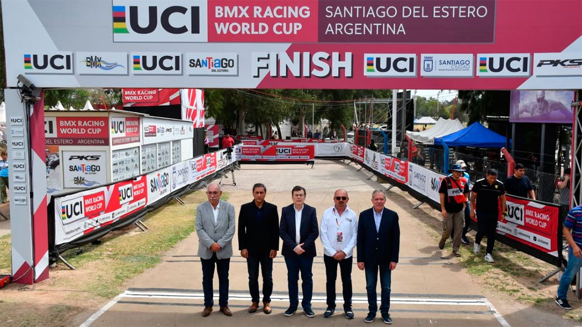 El gobernador Gerardo Zamora junto al jefe de gabinete de ministros, Elías Suarez, participó de la primera jornada de la Copa del Mundo UCI BMX Racing 2025, que se desarrolla del 20 al 21 de septiembre en la pista la Catedral del BMX del Polideportivo provincial, convocando a 300 pilotos de 26 países.