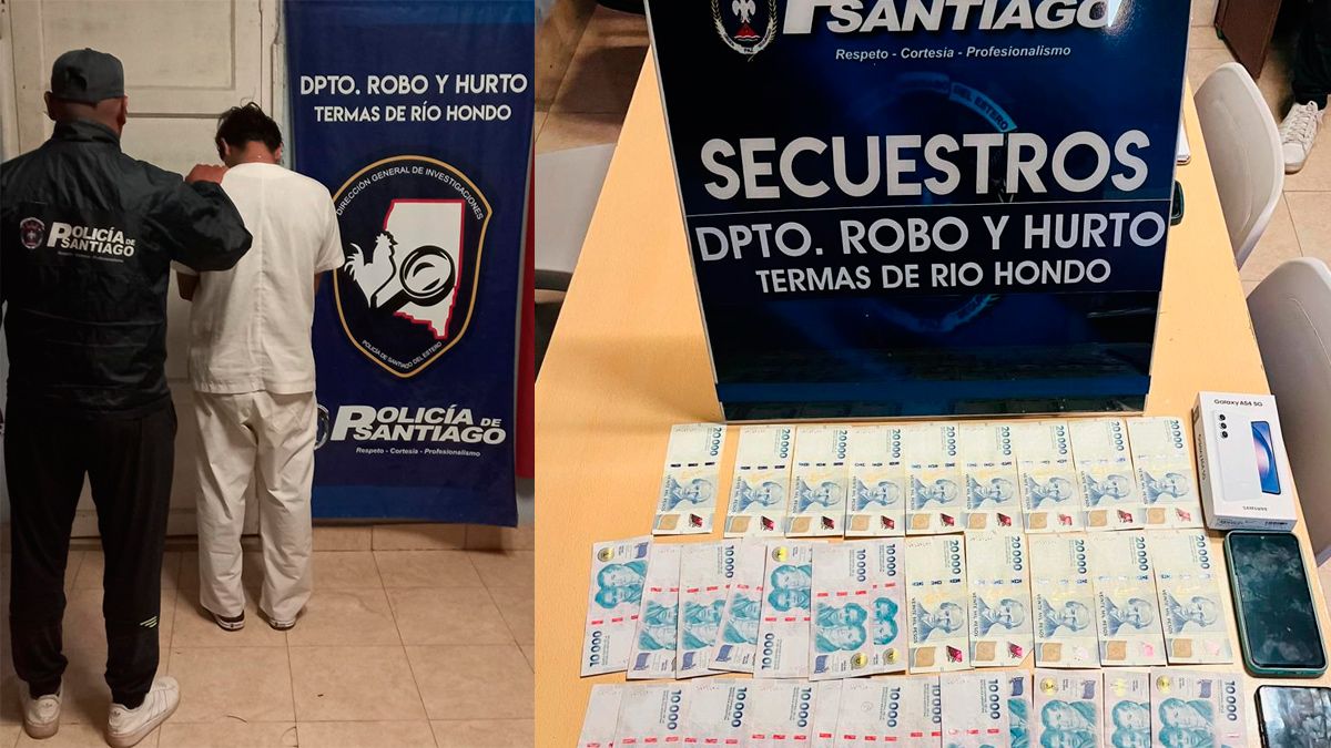 Con orden judicial, los investigadores del Departamento Robo y Hurto procedieron a la detención del joven en el mismo local, secuestrando una mochila con $60.000 en efectivo, un celular Samsung de reciente compra y otro teléfono de su propiedad. Posteriormente, en un departamento ubicado en calle Francisco Solano s/n, en Villa Río Hondo, donde residía el sospechoso, se incautaron $500.000 adicionales.