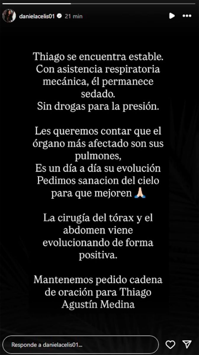 Daniela Celis brindó este domingo a la tarde una actualización clara sobre el estado de salud de Thiago Medina. La exparticipante de Gran Hermano explicó a través de su cuenta de Instagram que Medina se encuentra estable, asistido por respirador mecánico y permanece sedado. Aclaró que no requiere drogas para sostener la presión arterial y detalló que los pulmones son los órganos más afectados. Celis enfatizó que la evolución de Medina se evalúa día a día, como parte de un delicado proceso de recuperación. La cadena de oración por su salud continúa activa, convocando solidaridad y acompañamiento ante la situación incierta que vive el joven. Además, resaltó que la cirugía practicada tanto en el tórax como en el abdomen muestra progresos positivos. El pedido de fuerza y sanación se ha vuelto un mensaje constante en sus comunicaciones, reflejo de la esperanza que mantiene tanto la familia como el entorno cercano.