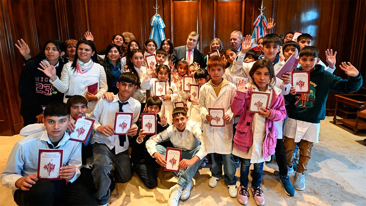 El gobernador Gerardo Zamora, junto al jefe de Gabinete de Ministros, Elías Suárez, recibió este martes por la mañana a 19 alumnos de la Escuela Nº 130 “Pedro Miguel Aráoz” de la localidad de El Desmonte, y a 8 estudiantes del Agrupamiento N° 86.051 (II) con sede en el Colegio Secundario de San Antonio, ambos establecimientos ubicados en el departamento Choya.