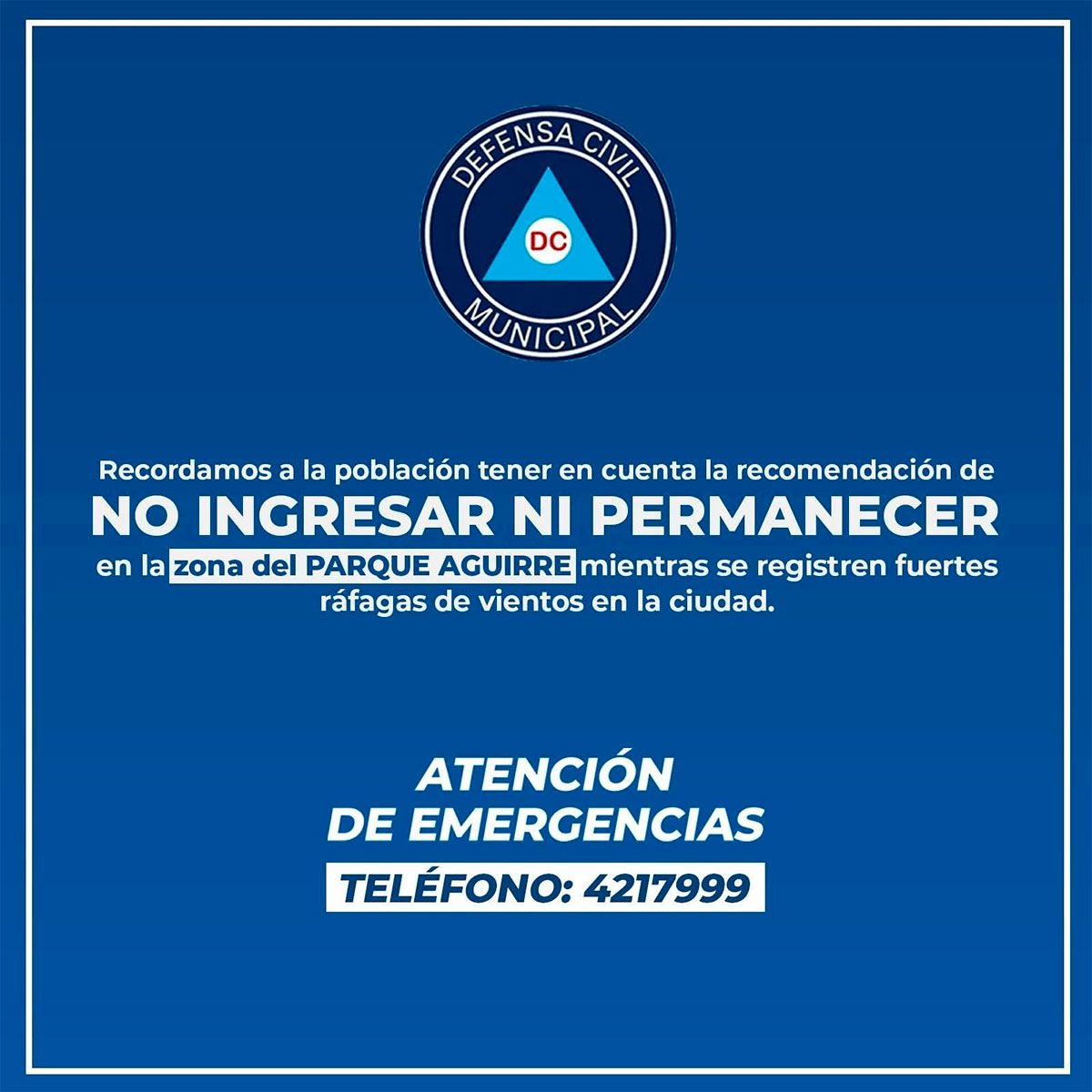 Las autoridades locales alertaron a la población sobre las fuertes ráfagas de viento que se están registrando en la ciudad. En este contexto, se recomienda no ingresar ni permanecer en la zona del Parque Aguirre hasta que las condiciones mejoren, con el fin de evitar posibles accidentes o inconvenientes derivados de los vientos intensos.