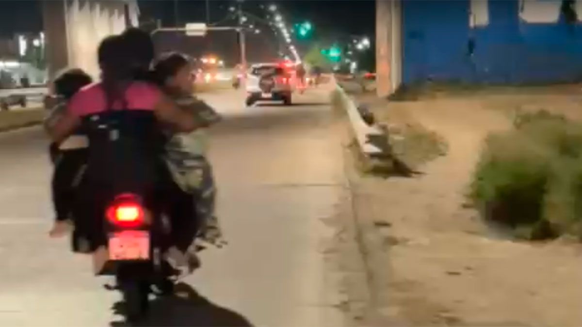 El registro, compartido por vecinos, muestra cómo una mujer transporta a dos niños pequeños, uno en cada brazo, mientras viaja en la parte trasera de la moto, que avanzaba por la intersección de avenida Lugones y Circunvalación, en el sector sur de la Capital.