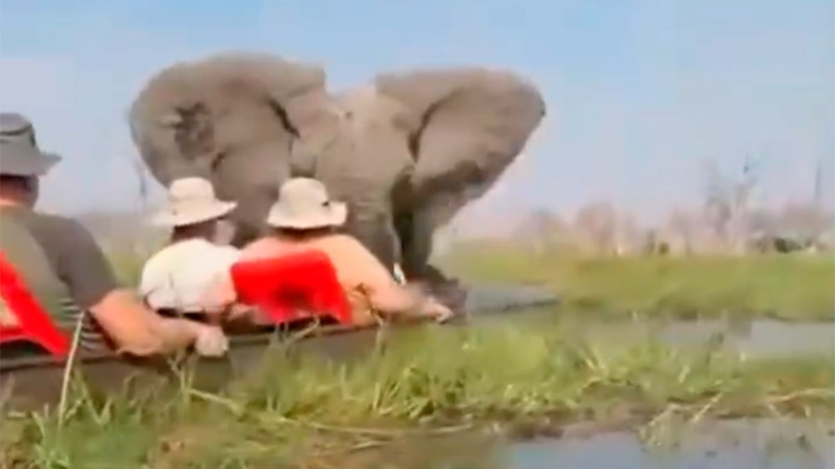 Un video captó el momento en el que el paquidermo derribó dos botes con su trompa, arrojando a cuatro personas a un agua infestada de cocodrilos.
