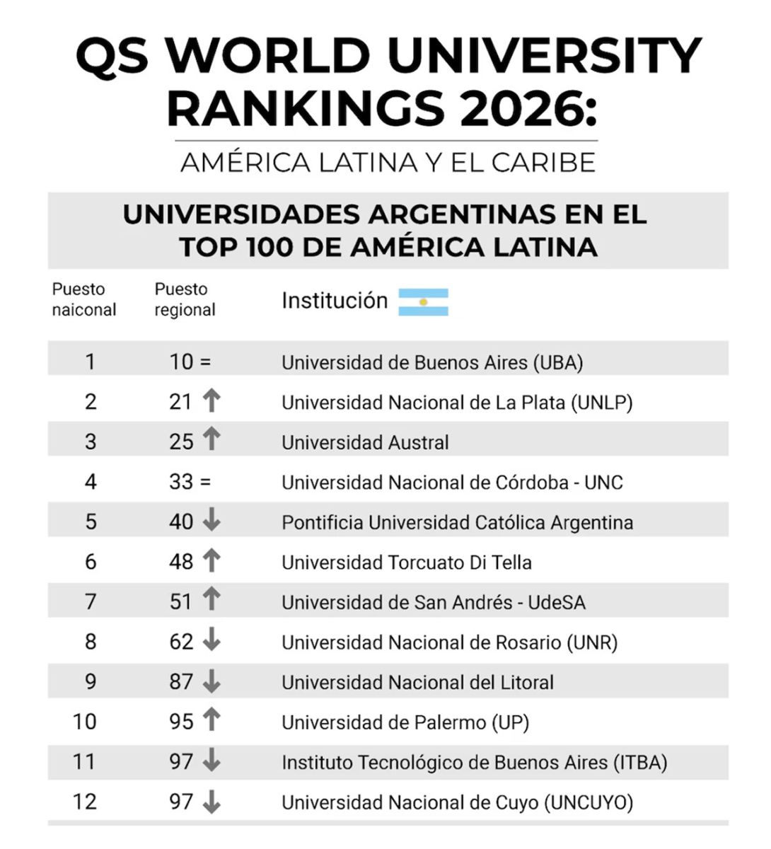 “El sistema de educación superior de Argentina es ampliamente reconocido por su tradición de acceso público y su sólida reputación académica, con la Universidad de Buenos Aires ocupando un lugar destacado entre los académicos y empleadores internacionales y el país disfrutando de algunos de los mejores recursos docentes de la región”, analizó Ben Sowter, vicepresidente senior de QS.