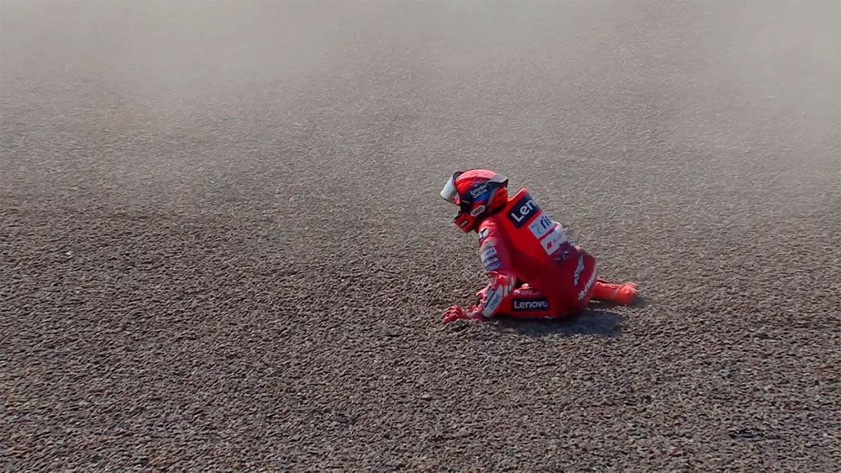 El impacto se produjo en la curva 7, luego de que Bezzecchi —autor de la pole position— fallara en la frenada y golpeara la rueda trasera de Márquez, provocando que ambos se fueran a la grava. El piloto de Ducati se levantó con gestos de dolor, sujetándose el hombro derecho, y abandonó la pista visiblemente afectado.