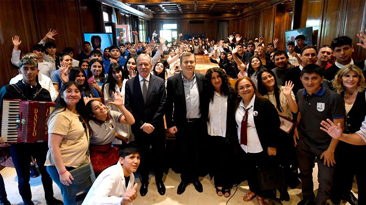 El encuentro se llevó a cabo en el Salón de Acuerdos “Juan F. Ibarra” donde los estudiantes estuvieron acompañados por sus docentes, quienes mantuvieron una charla amena con el mandatario provincial y el jefe de Gabinete, y aprovecharon la oportunidad para hacer un reconocimiento al Gobierno de la provincia por la inversión sostenida en materia educativa, tanto en infraestructura, como en equipamiento, herramientas tecnológicas, acceso a internet y a través de este tipo de programas que permiten ampliar los conocimientos sobre la provincia mediante un recorrido por la ciudad Capital, Las Termas y Villa La Punta.