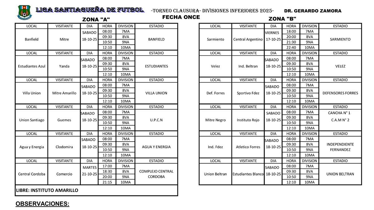 La Liga Santiagueña de Fútbol (LSF) dio a conocer la programación completa de la fecha 11 de las Divisiones Inferiores, que promete una agenda cargada de partidos en distintos puntos de la provincia.