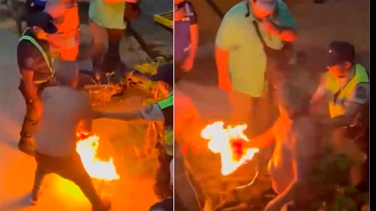 Ese mismo instante quedó registrado en el video que encabeza la nota, filmado por testigos que presenciaron todo el violento episodio. Se puede ver el momento exacto en el que saca el encendedor y le da mecha a su remera, aunque no se logra escuchar la amenaza que indicó la municipalidad.