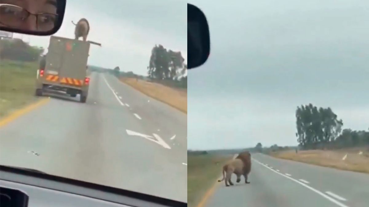 Un león escapó de un camión en movimiento en una ruta de Sudáfrica, protagonizando una escena que se viralizó en redes sociales y reavivó el debate sobre la seguridad en el transporte de animales salvajes. El momento fue captado por un hombre que viajaba por detrás y que, al ver al animal encima del vehículo, sacó su celular y grabó.