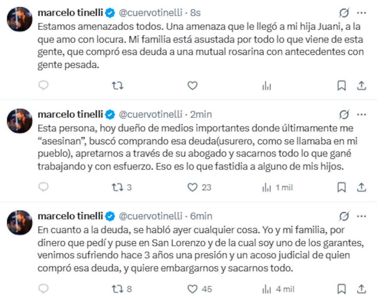 “Estamos amenazados todos. Una amenaza que le llegó a mi hija Juani, a la que amo con locura. Mi familia está asustada por todo lo que viene de esta gente, que compró esa deuda a una mutual rosarina con antecedentes con gente pesada”, explicó en un hilo de esa red social.