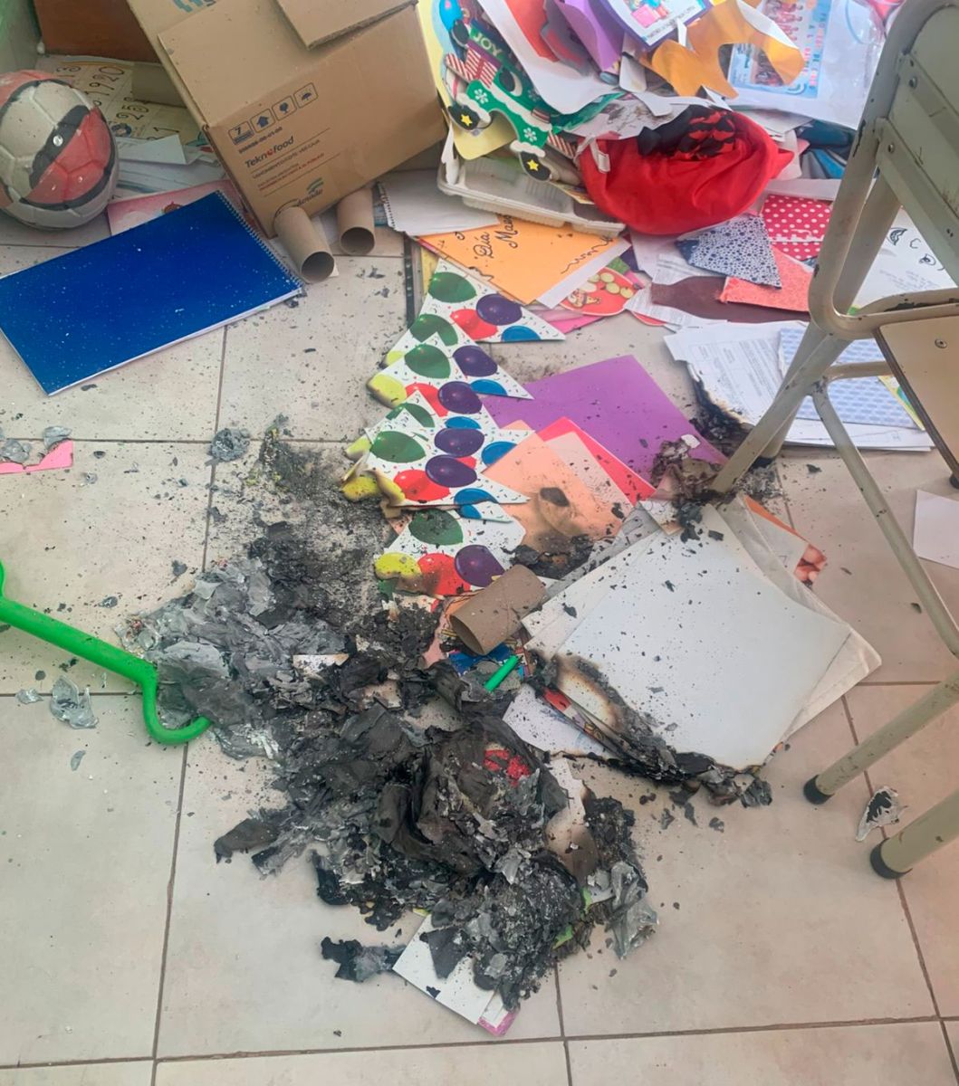 Además, dentro de una de las salas encendieron fuego que alcanzó a quemar carpetas y trabajos escolares. Según el testimonio recibido, el fuego podría haberse propagado y causado daños mayores si no se apagaba a tiempo.