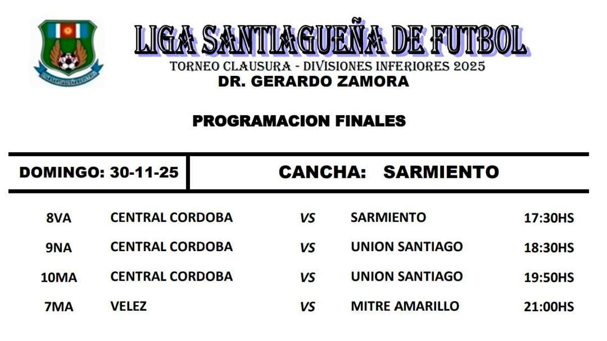 La Liga Santiagueña de Fútbol oficializó la programación de las finales del Torneo Clausura Dr. Gerardo Zamora, que se disputarán el próximo domingo. Será una jornada cargada de emociones, con cuatro categorías que irán en busca del título. Todo se jugará en el Estadio Ciudad de La Banda, escenario elegido para coronar a los nuevos campeones.