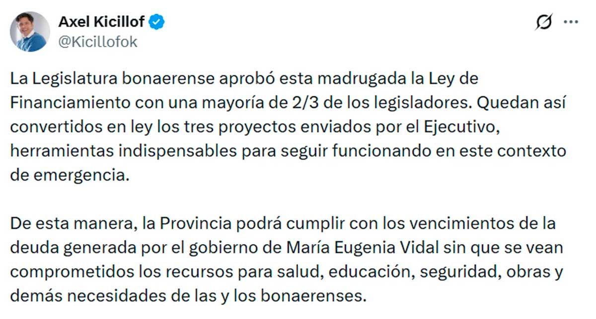 “Son herramientas indispensables para seguir funcionando en este contexto de emergencia”, dijo Kicillof en su mensaje, al tiempo que planteó que, de esta manera, la Provincia podrá cumplir con los vencimientos de la deuda que generó la ex gobernadora María Eugenia Vidal.