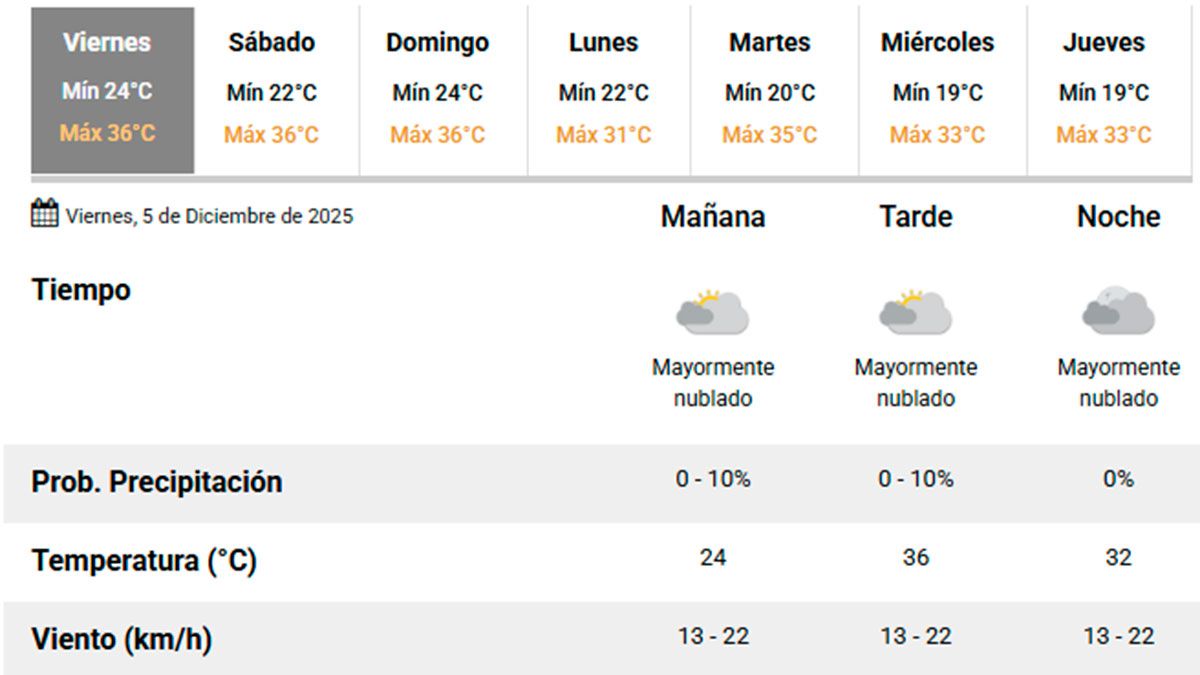Domingo: mínima de 24°C y máxima de 36°C, nuevamente bajo nubosidad variable.