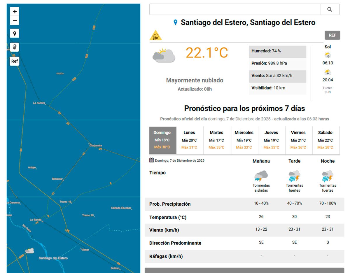 El SMN emitió un alerta amarillo por tormentas para los departamentos Atamisqui, Banda, Capital, Choya, Loreto, Ojo de Agua, Robles, San Martín y Silípica. El área será afectada por lluvias persistentes y tormentas de variada intensidad, con posibles episodios de granizo, ráfagas que podrían alcanzar los 70 km/h y abundante caída de agua en cortos períodos. Se prevén entre 40 y 60 mm de precipitación acumulada, valores que podrían ser superados de manera puntual.