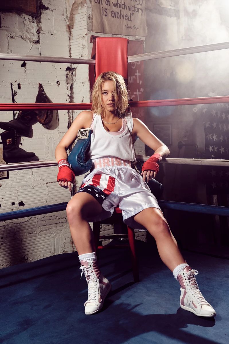 En la imagen principal, Sweeney aparece sentada dentro de un cuadrilátero con una musculosa blanca, shorts con la bandera estadounidense, vendas rojas en las manos y botas acordonadas. El look apunta a un estilo “entrenamiento realista”, con el pelo despeinado para sumar dramatismo. Detrás de ella, Christy Martin posa con indumentaria similar y una mano sobre su hombro, reforzando la conexión entre actriz y personaje.