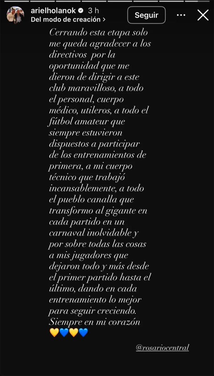 Rosario Central cerró el año como campeón de la Liga, en medio de fuertes polémicas, pero apenas 24 horas después el club sacudió el mercado al anunciar la salida de Ariel Holan. Este viernes, el entrenador rompió el silencio y publicó un mensaje de despedida a través de sus redes sociales.