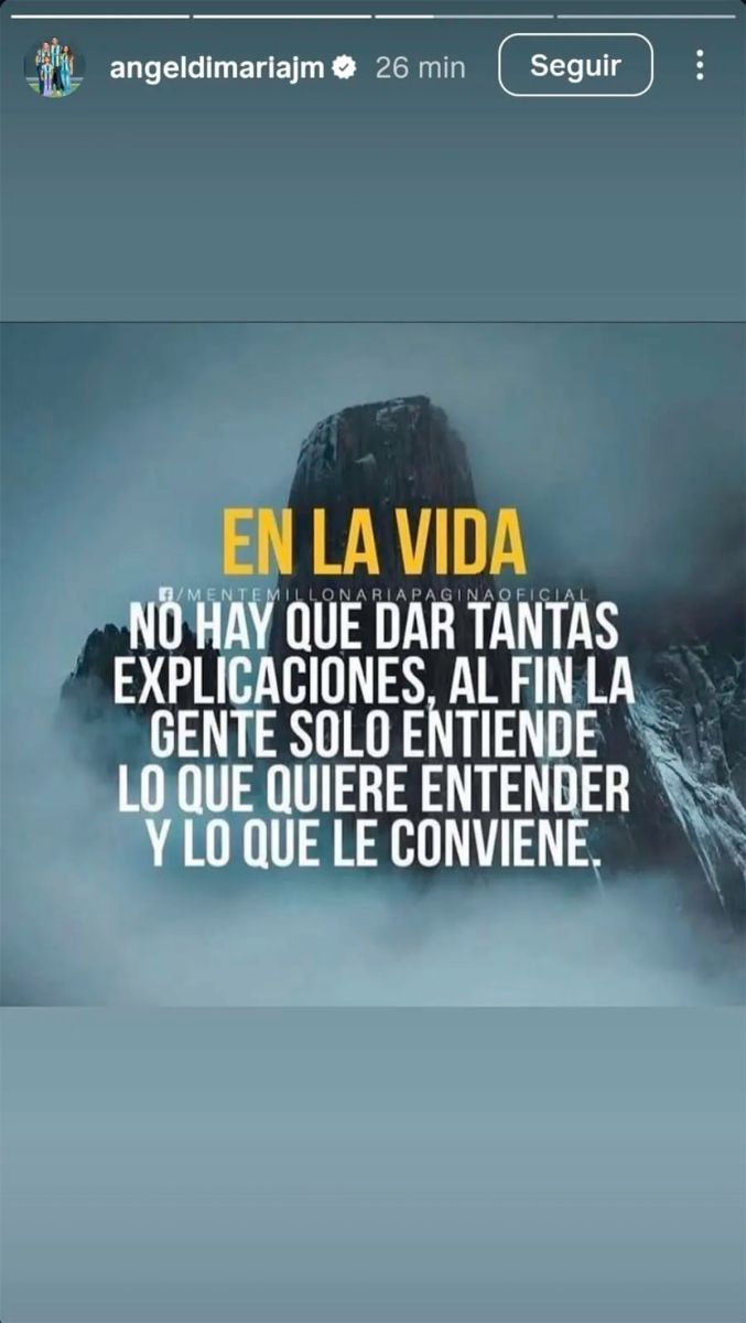 En ese contexto, Di María encendió la polémica en redes sociales. El campeón del mundo publicó una historia en su cuenta de Instagram con un mensaje sugestivo: “En la vida no hay que dar tantas explicaciones, al fin la gente solo entiende lo que quiere entender y lo que le conviene”. Además, le dio “me gusta” a dos publicaciones críticas contra Estudiantes y su presidente, Juan Sebastián Verón.