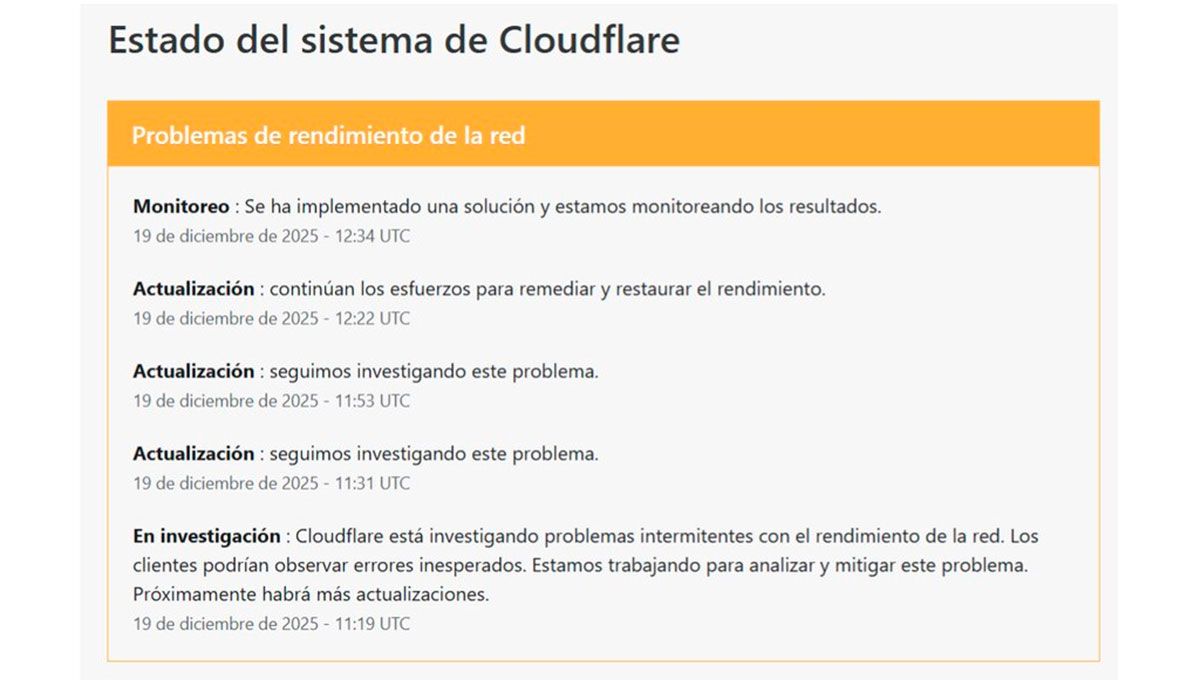 “En investigación: Cloudflare está investigando problemas intermitentes con el rendimiento de la red. Los clientes podrían observar errores inesperados. Estamos trabajando para analizar y mitigar este problema”, señala un comunicado de la empresa.