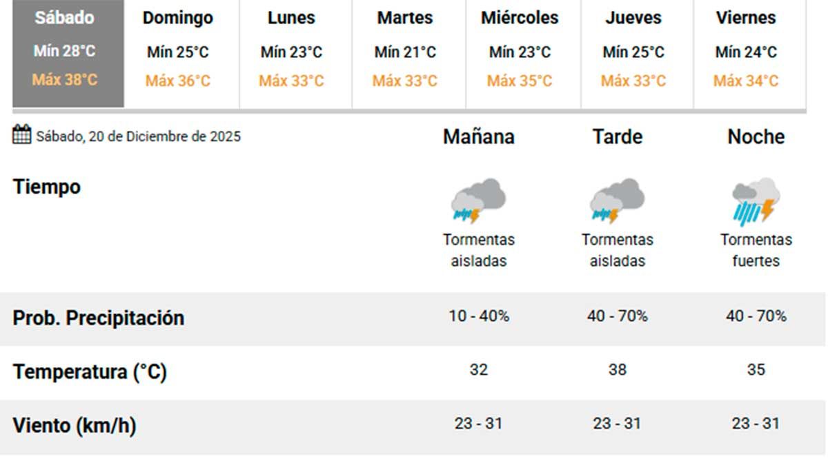 El Servicio Meteorológico Nacional (SMN) anticipa para este sábado 20 de diciembre altas temperaturas y condiciones inestables en Santiago del Estero y zonas aledañas.