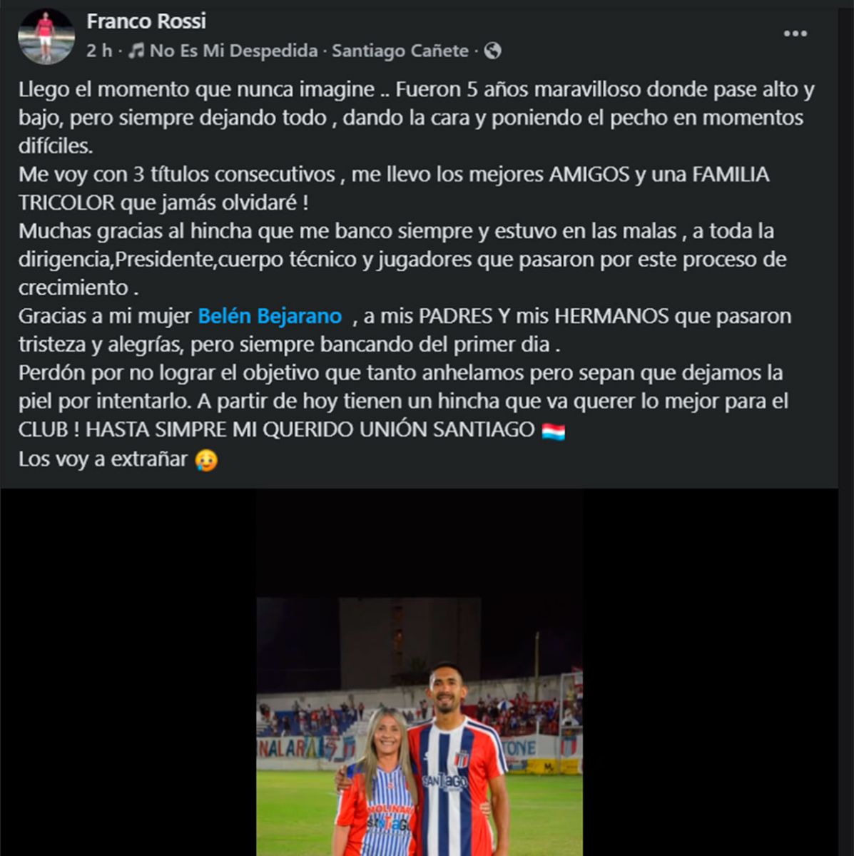 Finalmente, Rossi pidió disculpas por no haber alcanzado el objetivo final en el torneo y cerró su mensaje con una frase que resume su vínculo con la institución: “A partir de hoy tienen un hincha que va a querer lo mejor para el club. Hasta siempre, mi querido Unión Santiago”.
