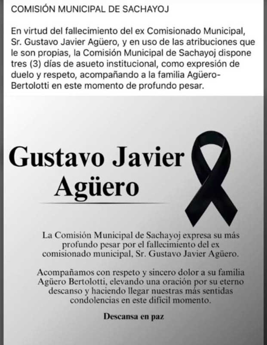 Tras conocerse la triste noticia, la Comisión Municipal de Sachayoj, quien es comandada hoy por María Zerda, dispuso tres días de asueto institucional, como expresión de duelo y respeto, acompañando a la familia Agüero-Bertolotti en este momento de profundo pesar.