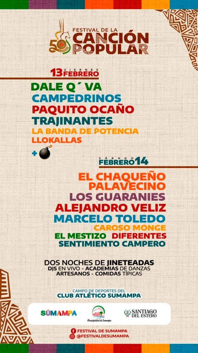 La 50º edición del Festival de la Canción Popular de Sumampa promete ser una verdadera fiesta de la cultura, la tradición y la música, reafirmando su lugar como un evento emblemático del calendario festivalero de Santiago del Estero.