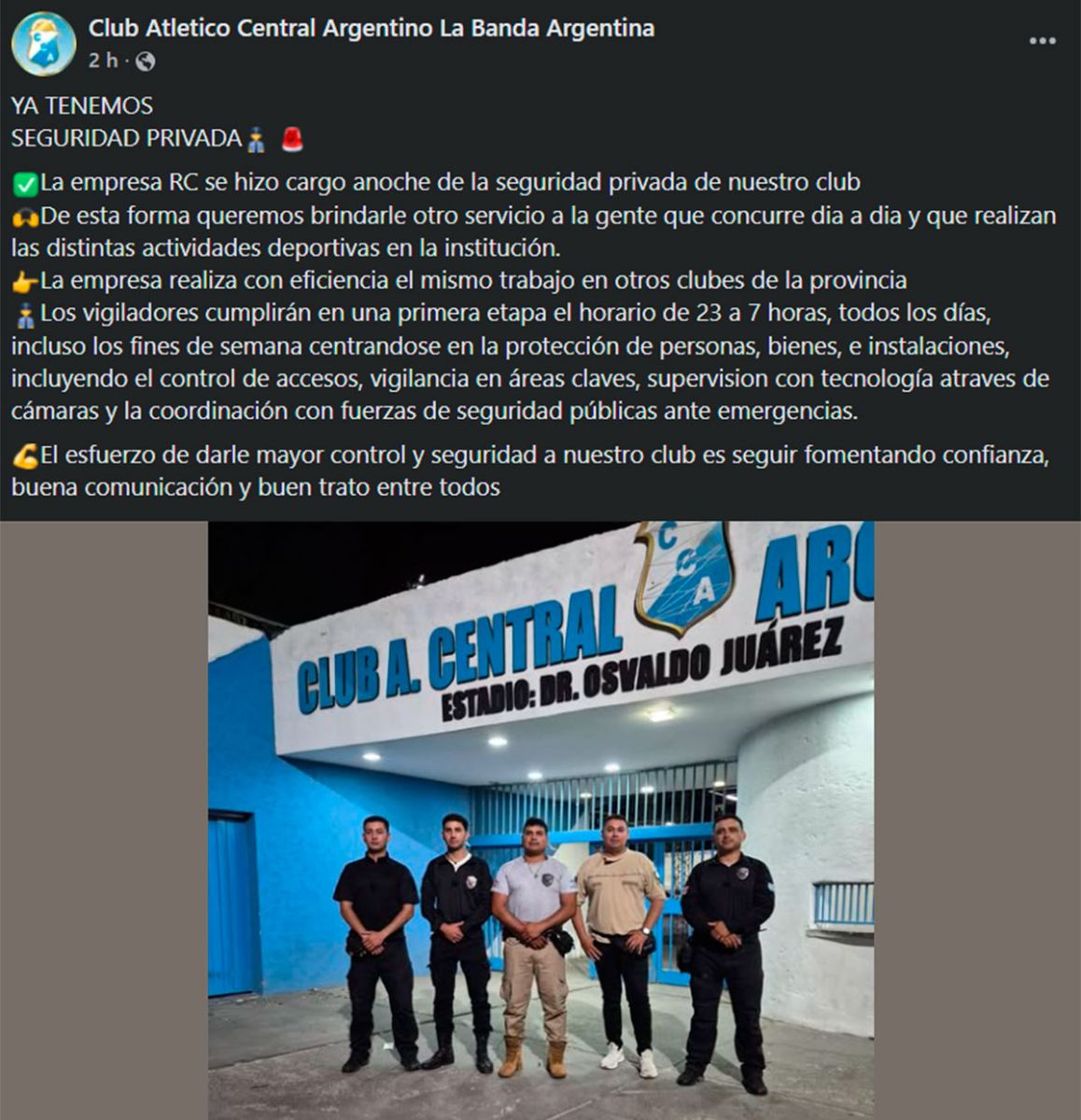 A través de sus redes sociales, el Club Atlético Central Argentino informó la contratación de una empresa privada, que ya se hizo cargo de la vigilancia del club. La decisión apunta a brindar un nuevo servicio para quienes concurren diariamente y participan de las distintas actividades deportivas.