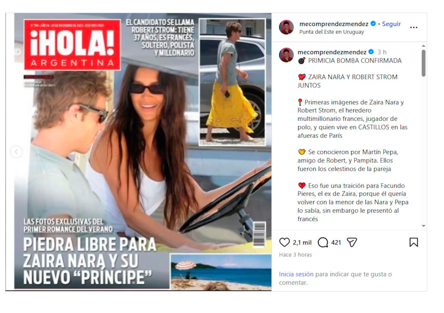 Los rumores de romance empezaron a mediados de este mes. "Zaira Nara está en pareja con Robert Strom. ¿Quién es Robert Strom? Es el nuevo novio de Zaira Nara: heredero archirecontra millonario, magnate europeo, nacido en Francia. Viven en castillos, son amigos de la realeza de Charlotte de Mónaco, el abuelo fue mega amigo de Juan Carlos I de España", había contado Gustavo Méndez en La posta del espectáculo (TV Pública).
