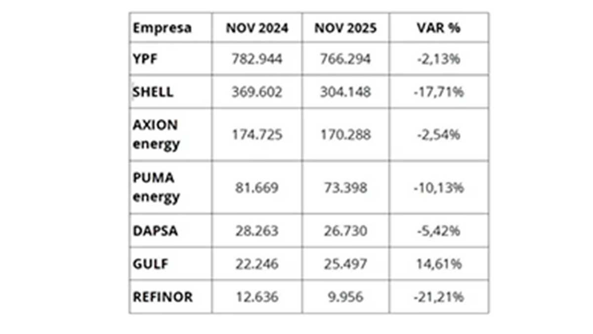 Con excepción de Gulf (+14,61%) todas las compañías vieron una caída en sus ventas respecto a noviembre del 2024.