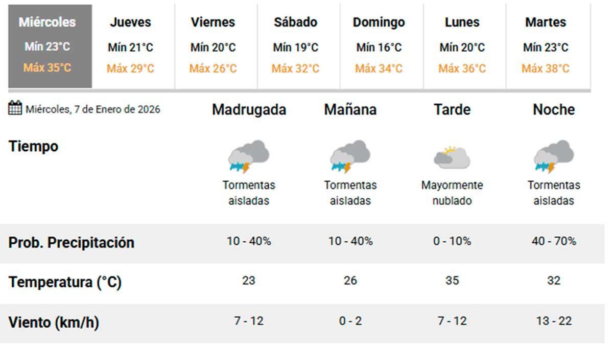 Para este miércoles 7 de enero, el Servicio Meteorológico Nacional prevé una jornada con temperaturas elevadas en Santiago del Estero, con una máxima de 35 °C y una mínima de 20 °C.