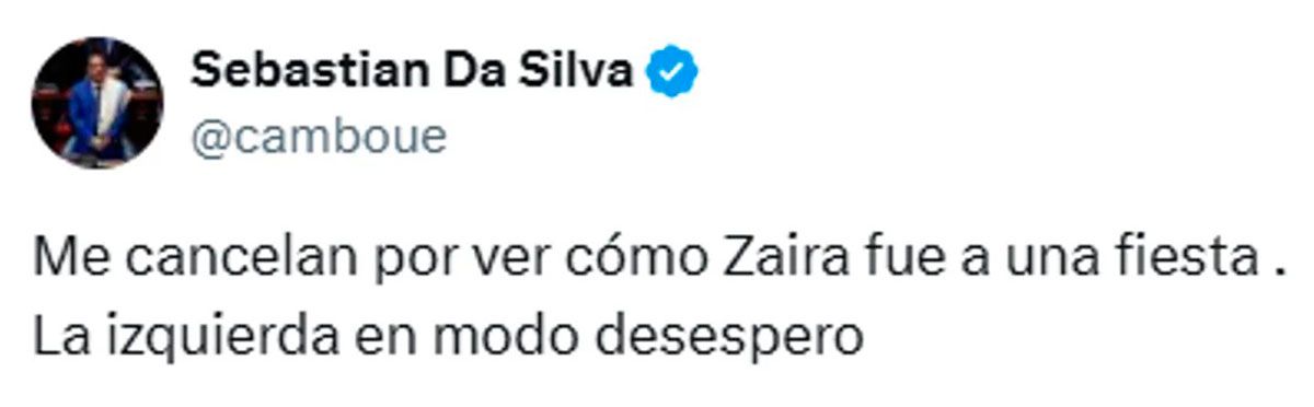 Lejos de pedir disculpas, Da Silva utilizó su cuenta oficial de X (antes Twitter) para responder a las críticas y confrontar a quienes lo señalaron por su conducta. “Me cancelan por ver cómo Zaira fue a una fiesta. La izquierda en modo desespero”, escribió el legislador, vinculando los cuestionamientos a una supuesta persecución política por parte de sus opositores.