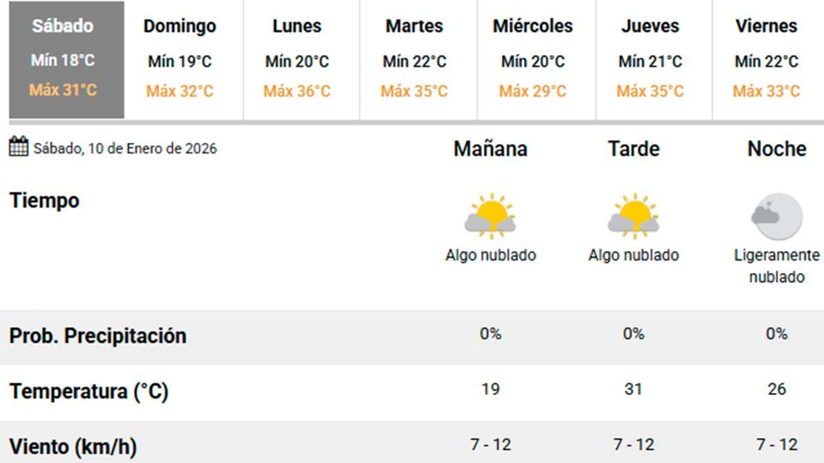 Las temperaturas oscilarán entre los 17 °C de mínima y los 31 °C de máxima, con valores térmicos muy parecidos a los esperados para el domingo 11 de enero. La ausencia de lluvias en el pronóstico permitirá un sábado con tiempo estable, aunque la sensación térmica podría sentirse más elevada durante las horas de mayor insolación.